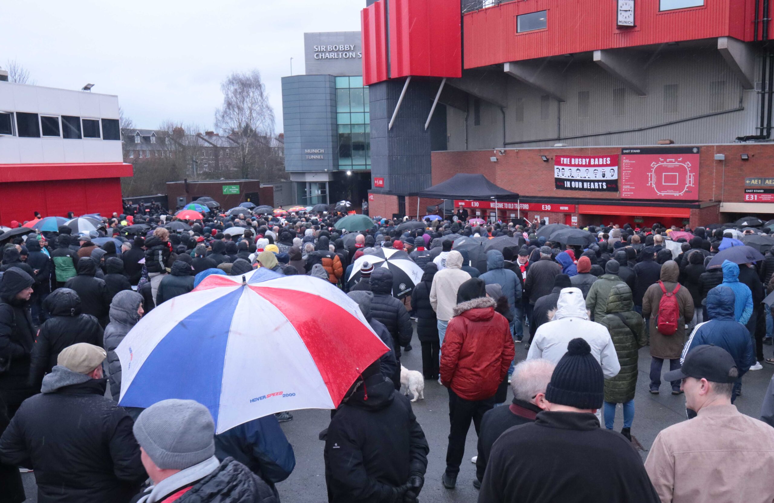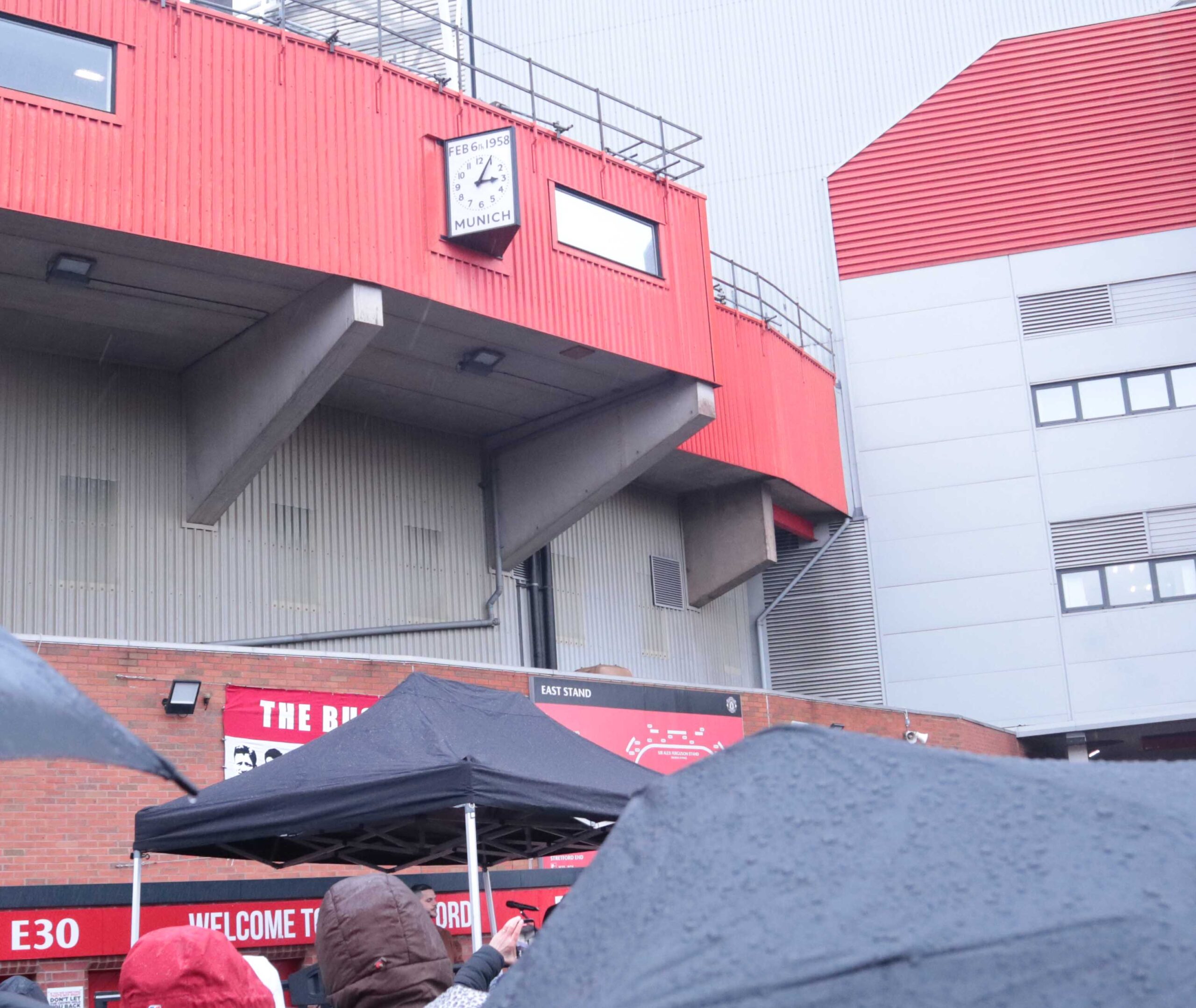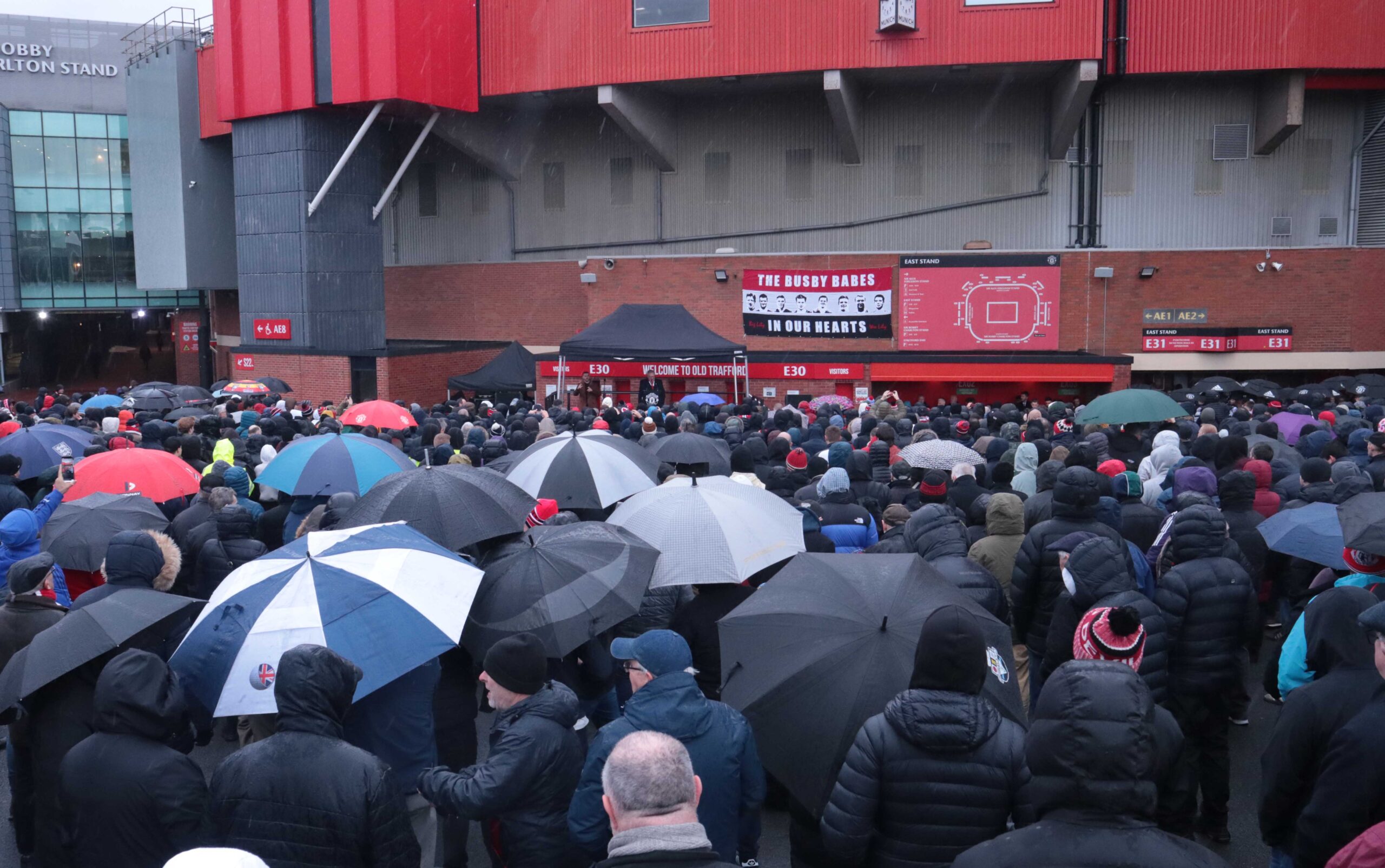 Manchester United fans came to Old Trafford enduring the terrible weather to pay their respects to the players, officials and reporters who lost their life at the 1958 Munich Air Disaster.
